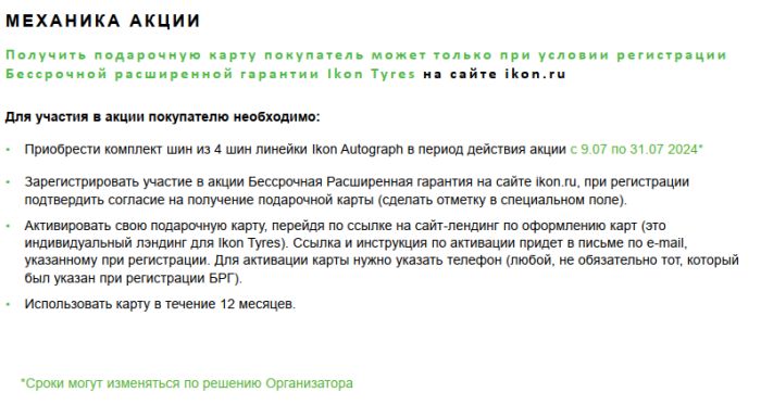 C 09.07.2024 до 14.10.2024, при покупке комплекта 4 летних или зимних шин премиальной линейки Ikon Autograph, в шинном центре "Питстоп", Вы получите подарок: виртуальную карту с суммой, которая зависит от модели и типоразмера шин.